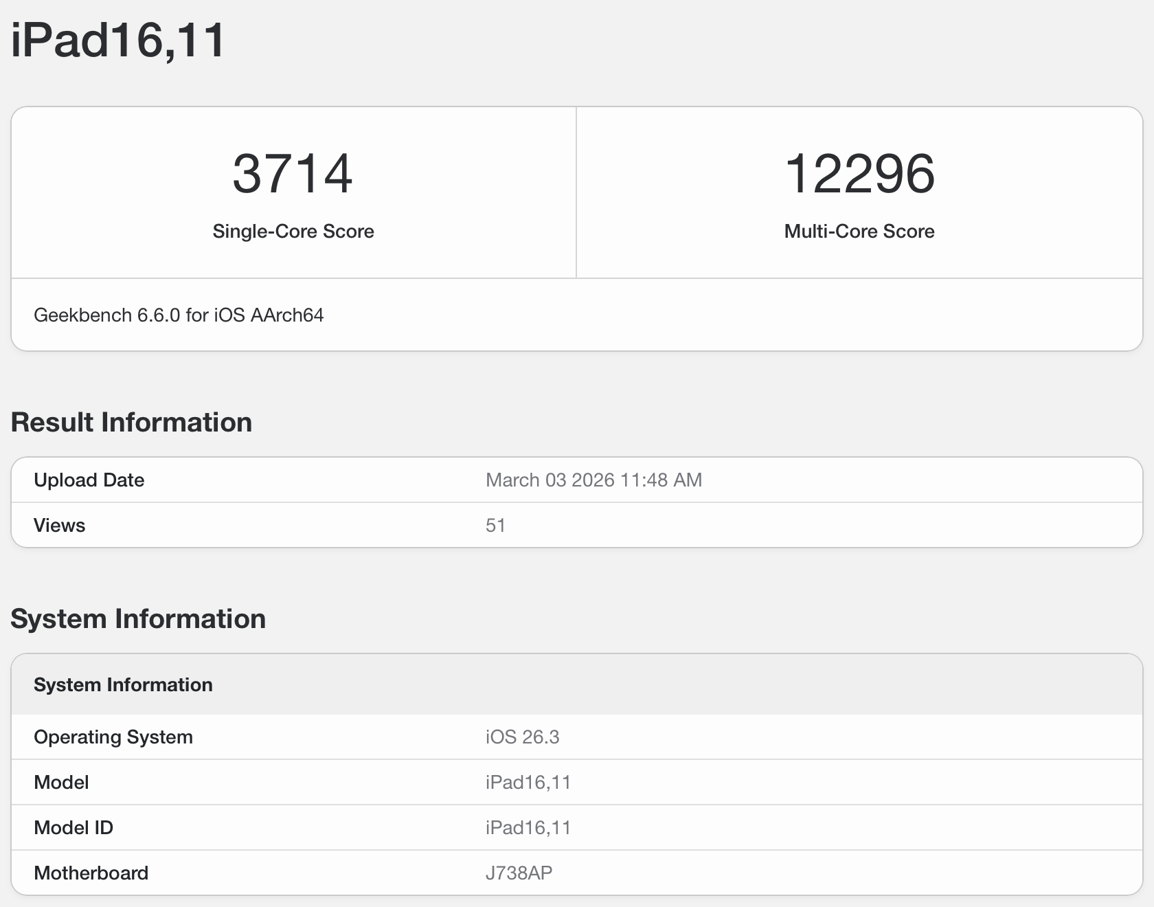 Пара бенчмарків для 13-дюймового M4 iPad Air з Wi‑Fi + Cellular (iPad16,11) свідчить, що CPU M4 iPad Air на 17,3% швидший в одноядерній продуктивності та на 7,9% швидший у багатоядерній.